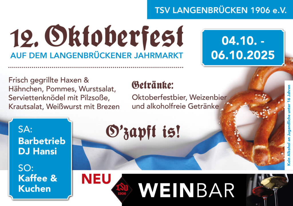 Der TSV Langenbrücken möchte die Bevölkerung von Langenbrücken und Umgebung ganz herzlich zum Oktoberfest beim Langenbrückener Jahrmarkt einladen. Unser Zelt steht wie gewohnt auf dem Parkplatz vor der Kraichgauhalle.
