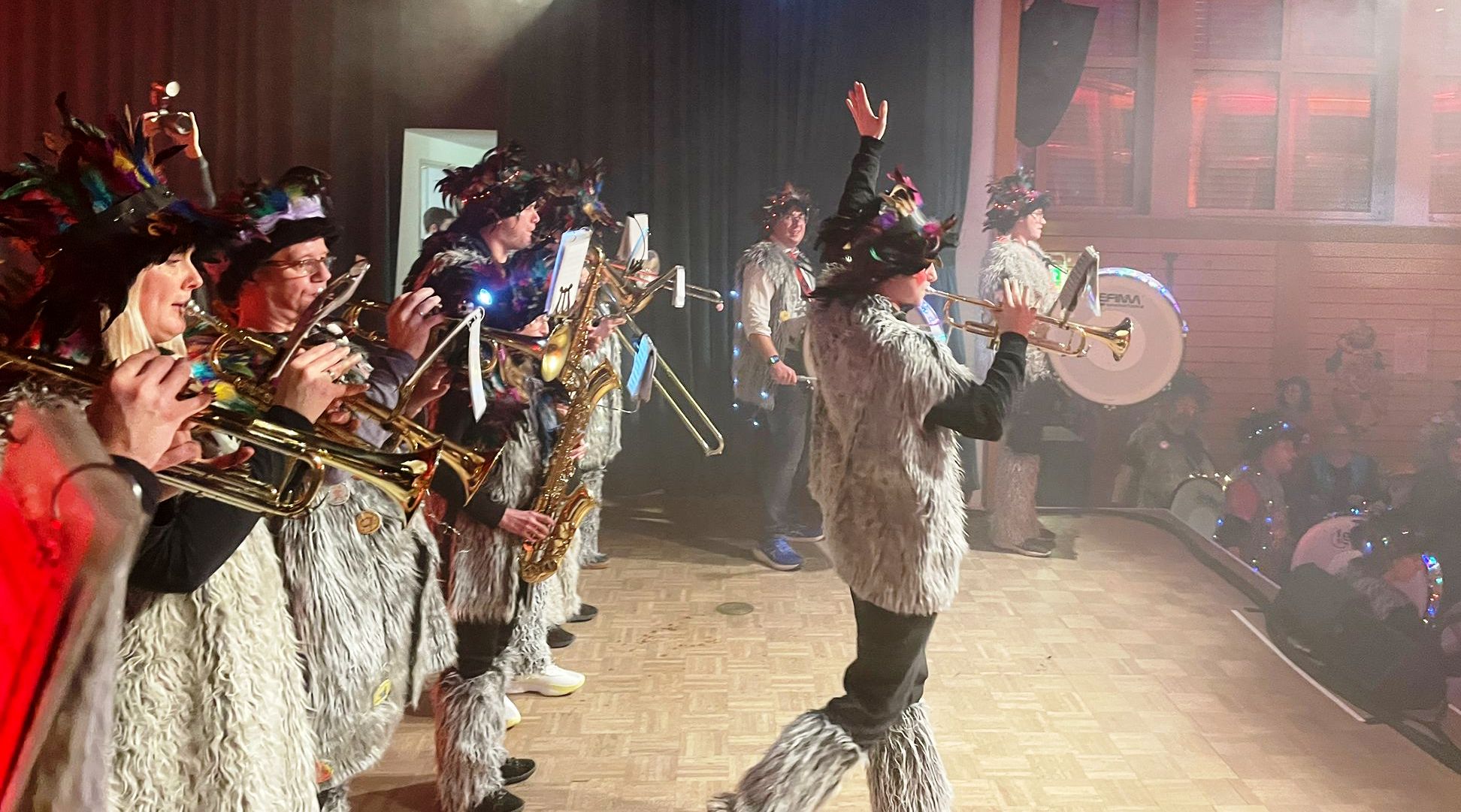 Modern blieb es mit der LA Hip Hop Truppe, die in gewohnt hoher Qualität mit präzisen Schritten zu packenden Beats überzeugte. Der emotionale Siedepunkt vor der Pause war jedoch erreicht, als die Longerbrigger Schlabbegugge einmarschierten: Der brachiale Sound riss die Gäste von den Stühlen, kein Halten war mehr in der Halle. Den Übergang in die verdiente Unterbrechung gestaltete schließlich LA Dance Art mit einer einfühlsamen Performance, die in einer gigantischen Polonaise mündete und das gesamte Narrenvolk erfasste.