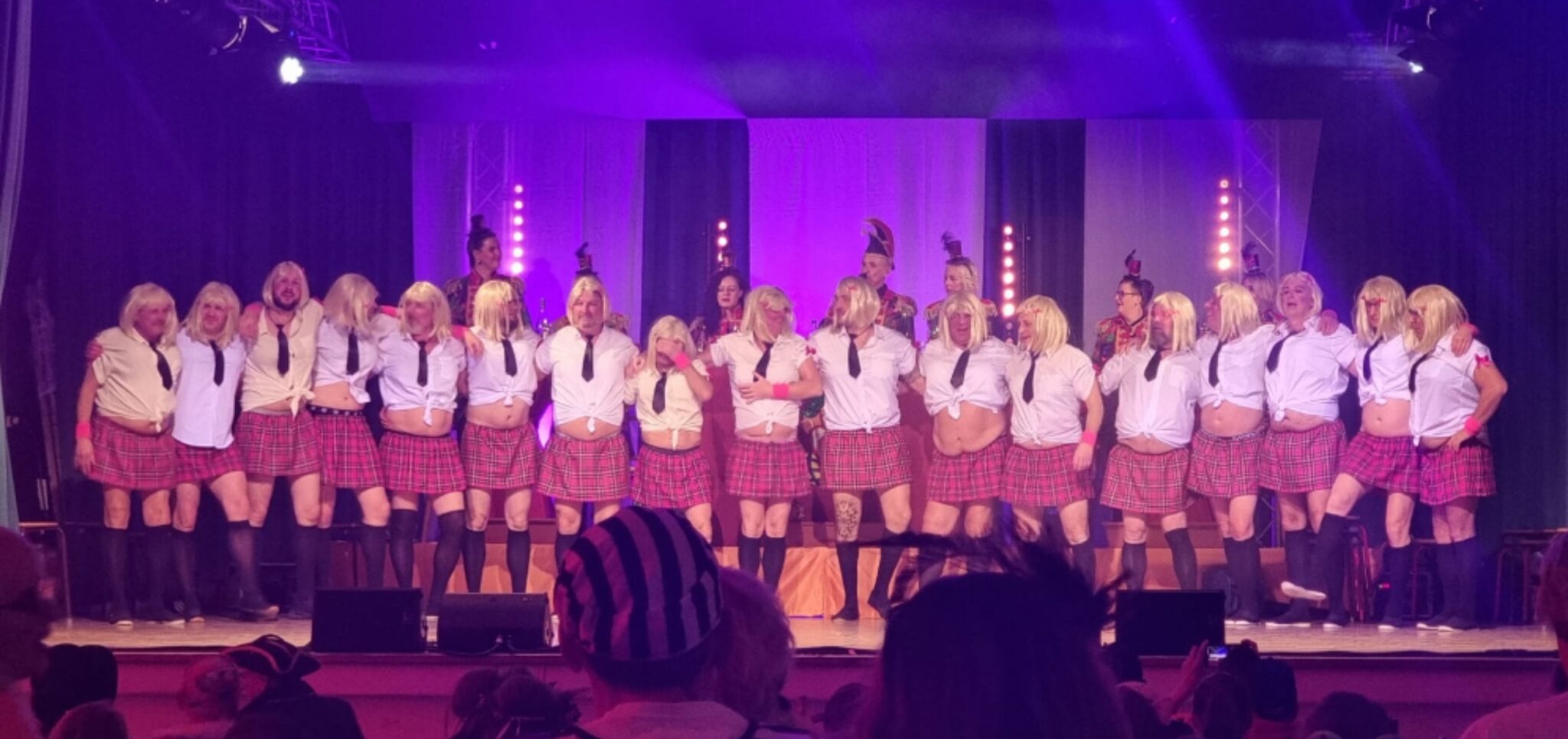 Ein absoluter Höhepunkt des Abends war der Auftritt von Chantal alias Ralf Patig. Mit ihrer unterhaltsamen Art brachte sie den Saal nicht nur zum Toben, sondern nahm auch die lokale Prominenz ins Visier: In einer denkwürdigen Aktion mussten Rudolf Dickgießer, Matthias Harbusch, Bürgermeister Huge und Sitzungspräsident Abilio Coelho-Schäfer persönlich Farbe bekennen – und zwar in Leo-Unterhosen, die direkt vor Ort übergezogen wurden. Nach diesem Spektakel glänzten die LA Showgirls mit sportlicher Eleganz. Ihr perfekt einstudierter Showtanz beeindruckte durch enorme Synchronität und tänzerische Präzision. Für die letzte große Attacke auf die Lachmuskeln sorgte Frl. Schneider alias Charly Schneider aus Rheinsheim, dessen Geschichten und Pointen das Publikum bis an die Belastungsgrenze forderten. Den krönenden Abschluss eines rundum gelungenen Abends setzte das TSV-Männerballett. In knappen Schulmädchenkostümen legten die Herren einen „sexy“ Auftritt hin, der die Stimmung ein letztes Mal zum Überkochen brachte. Nach dem großen Finale war jedoch noch lange nicht Schluss: DJ Thomas Endres übernahm das Pult und sorgte dafür, dass das närrische Volk noch schöne Stunden das Tanzbein schwingen konnte.